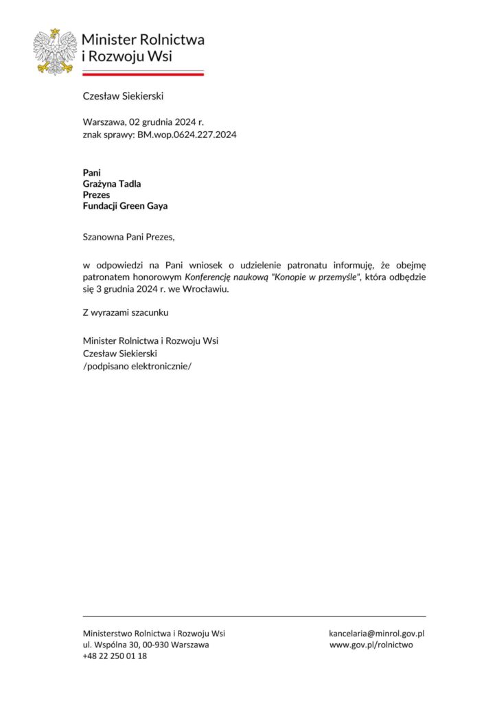 Z dumą informujemy o objęciu patronatem honorowym Ministra Rolnictwa i Rozwoju Wsi Czesława Siekierskiego Konferencji naukowej „Konopie w przemyśle”